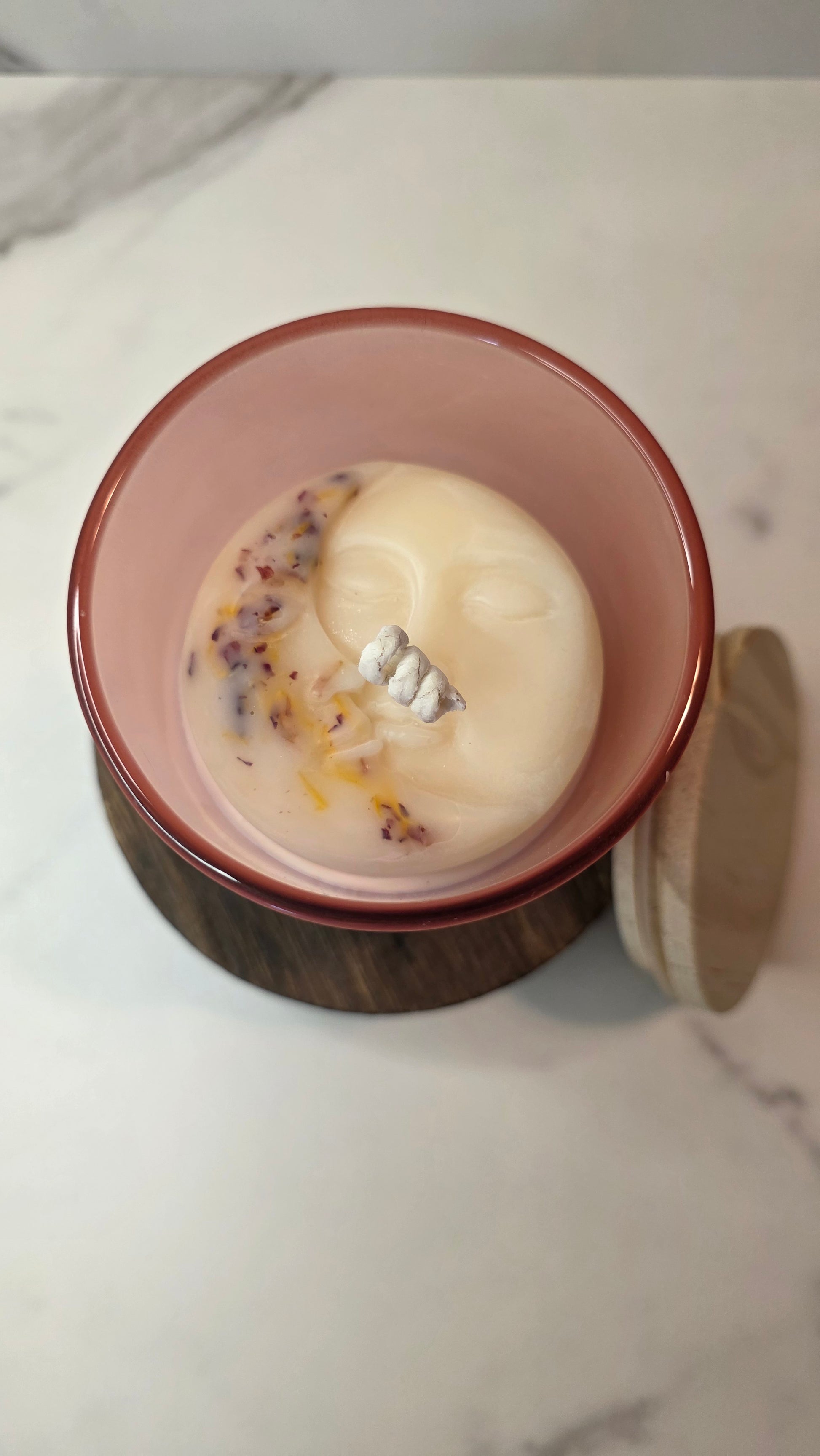 6oz Soy Wax Candle with Moon embed and Bamboo Lid (Pink Frosted Glass)